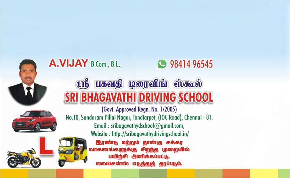 Sri Bhagavathy Driving School in Chennai is one of the leading businesses in the Motor Training Schools For Women. Also known for Motor Training Schools, RTO Consultants, Driving License Consultants, Motor Training Schools For Two Wheeler, Motor Training Schools For Men and Women, Driving School Door Step Services, Two Wheeler Motor Training Schools For Women and much more. Find Address, Contact Number, Reviews & Ratings, Photos, Maps of Sri Bhagavathy Driving School, Chennai.